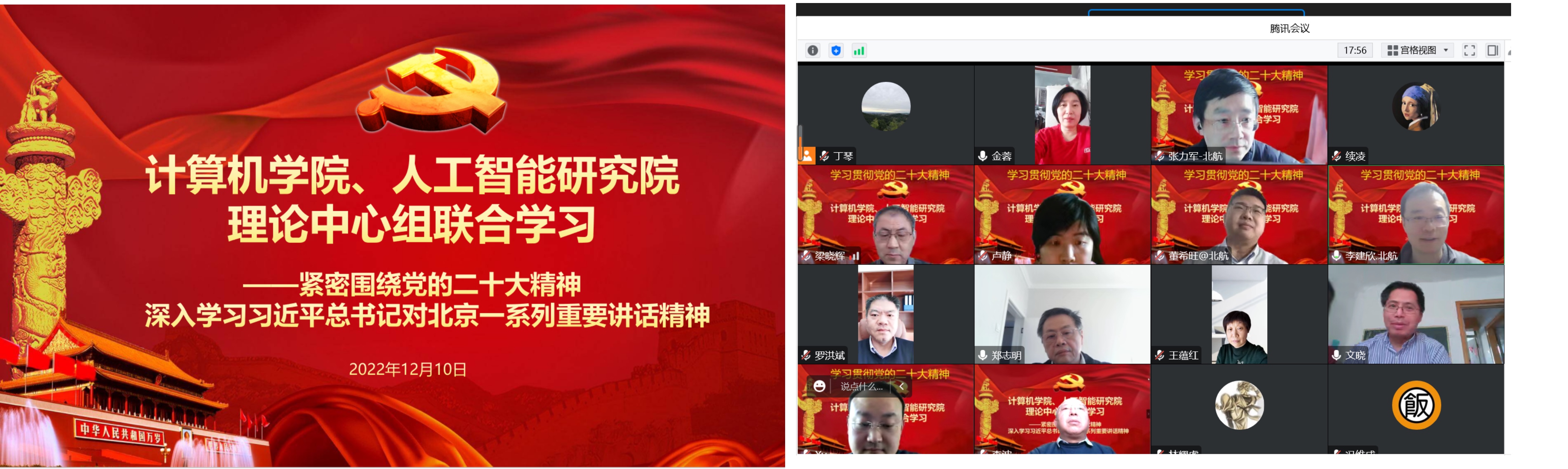为进一步深入学习贯彻二十大精神,12月10日下午,人工智能研究院和计算机学院围绕“深入学习习近平总书记对北京一系列重要讲话精神”主题举办理论中心组联合学习会。此次学习会采取线上会议的形式举行,两个党委及领导班子共计13人参加了学习,会议由人工智能研究院党委书记金蓉主持。