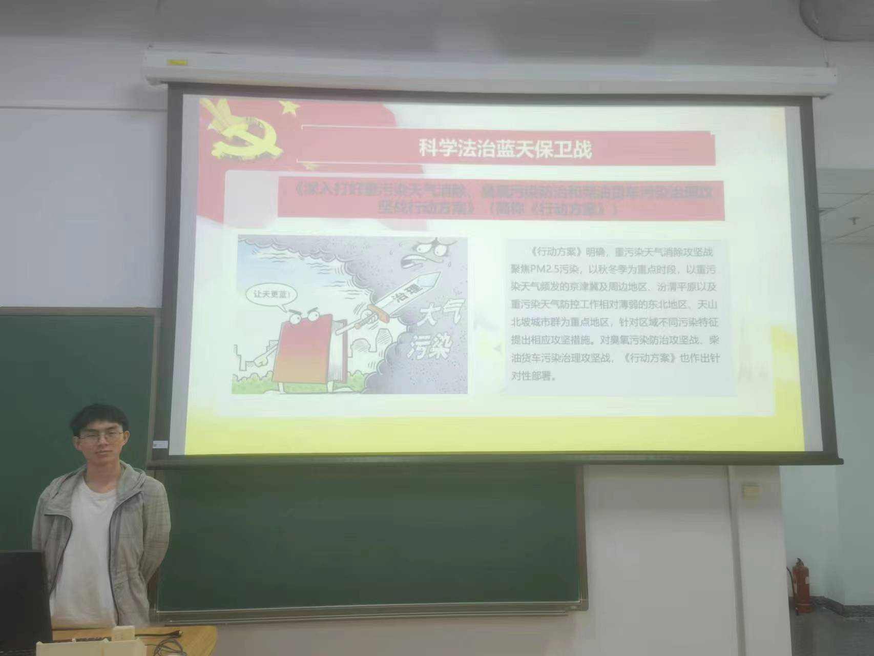 张必浪同学阐述了深入推进环境污染防治的必要性。如今,大气污染、水源污染、土壤污染等防治形势仍然比较严峻,我们必须保持战略定力,坚持方向不变、力度不减,守牢生态环境安全底线。他以蓝天保卫战为例,简要介绍了国家出台的《深入打好重污染天气消除、臭氧污染防治和柴油货车污染治理政策攻坚战行动方案》,方案指出,要重点治理PM2.5污染,特别是在秋冬季时段和薄弱地区。方案还提出了防治的目标:到2025年,基本消除全国重度及以上污染天气,降低PM2.5和臭氧的浓度。除了法律法规外,国家还推出了政策措施组合拳,用法治的手段保障生态环境安全。