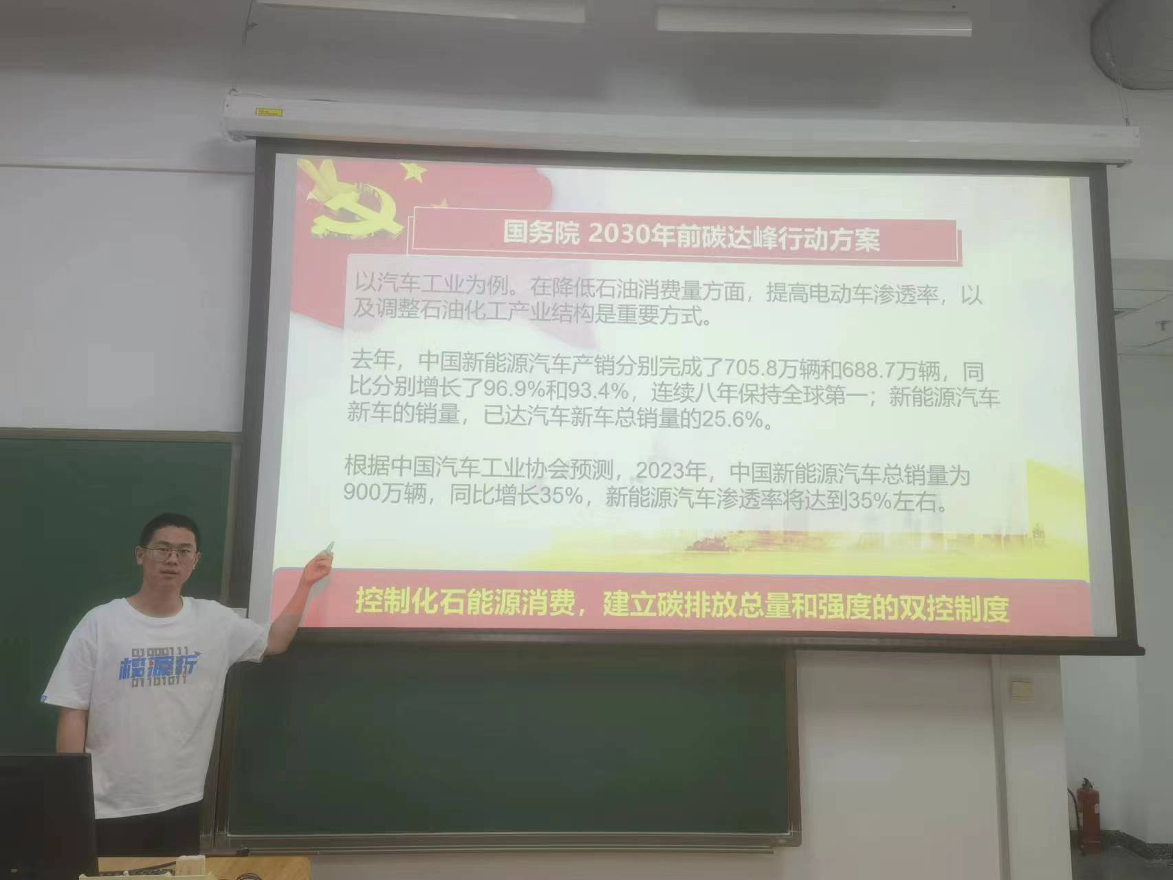 陈屹峰同学指出了国家积极稳妥推进碳达峰碳中和的目标。他首先介绍了碳达峰和碳中和的概念,接着依据我国的碳排放现状,解读了国务院颁布的《2030年前碳达峰行动方案》。方案提出了四个重点举措:控制化石能源消费,建立碳排放总量和强度的双控制度;深入推进能源革命,加快建设新型能源体系;完善碳排放统计核算制度,健全碳排放权市场交易制度;提升生态系统碳汇能力,积极参与应对气候变化全球治理。我们始终坚持先立后破,有计划分步骤实施碳达峰行动。