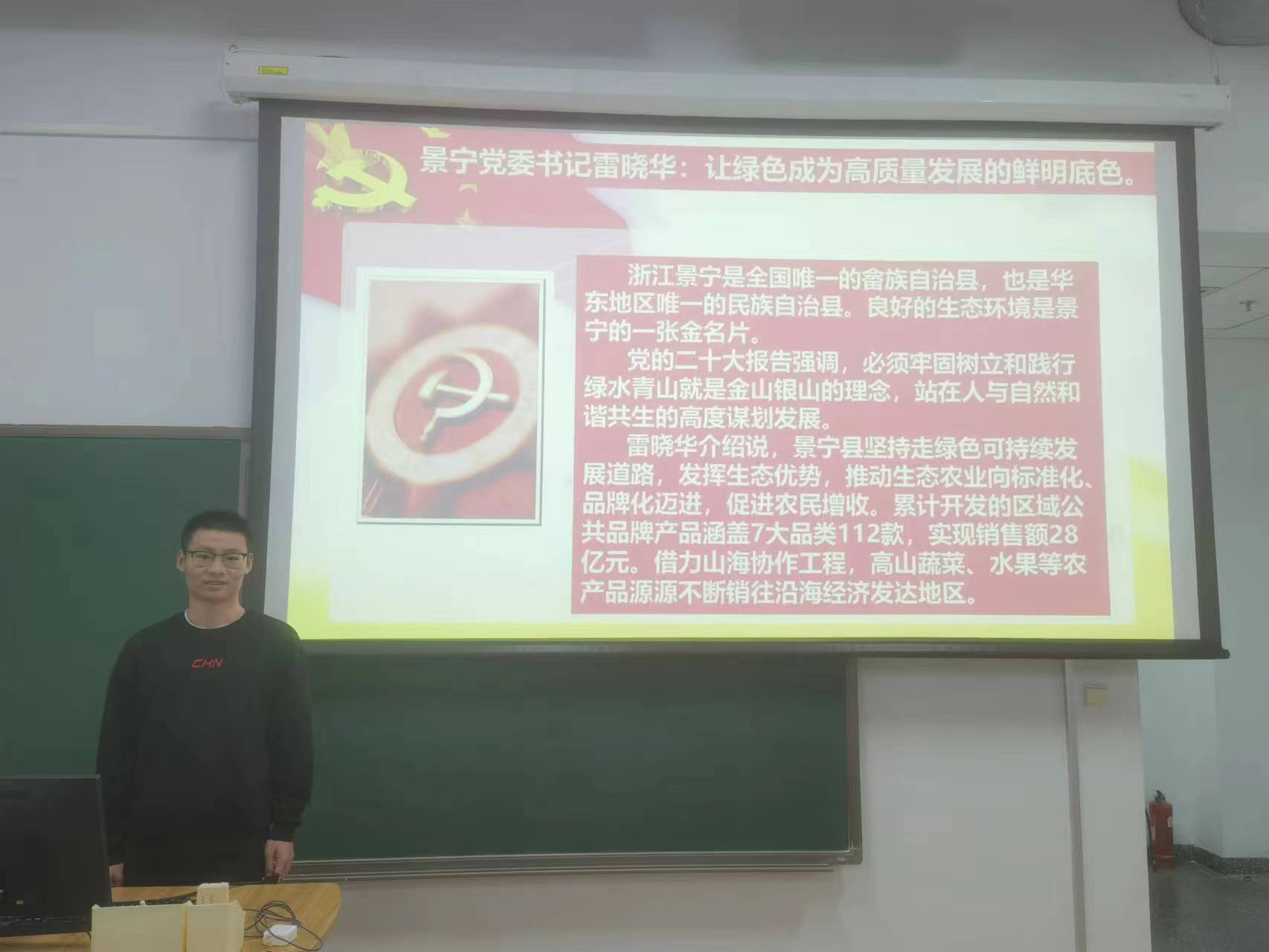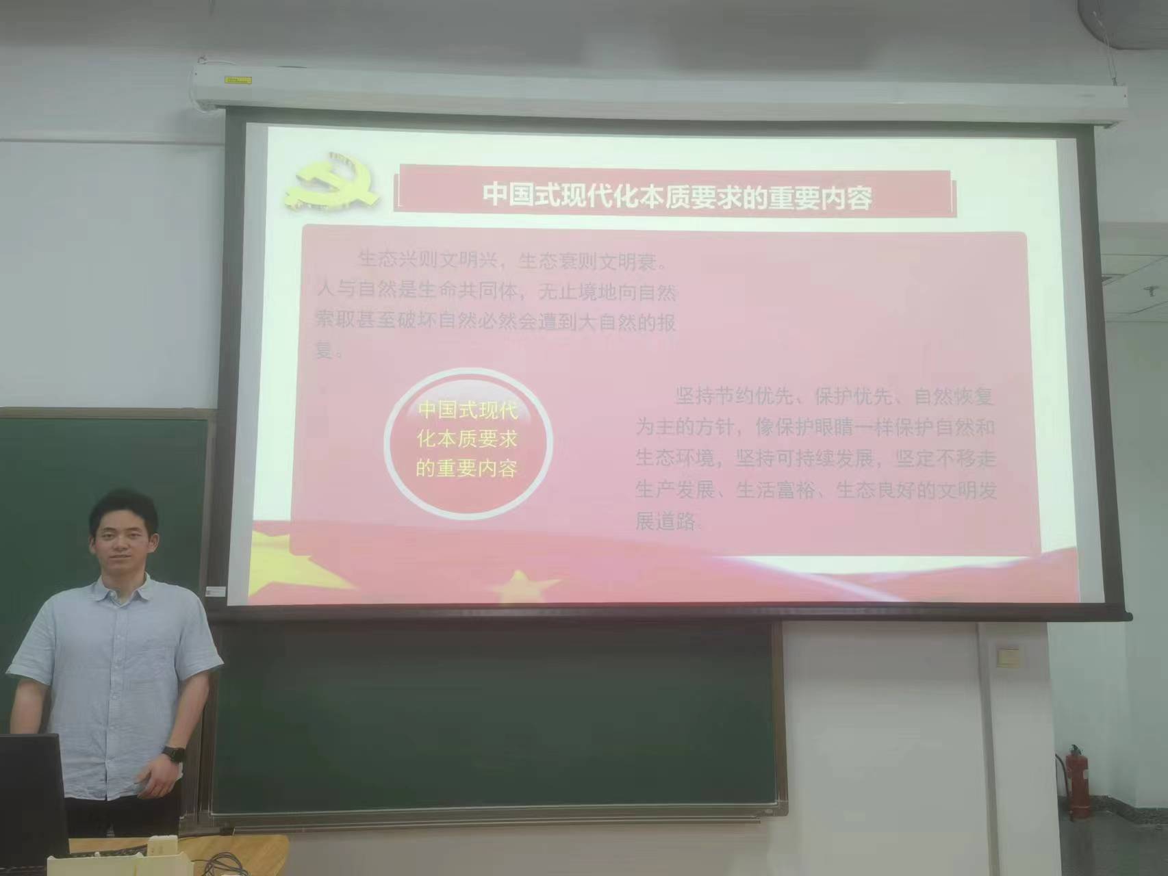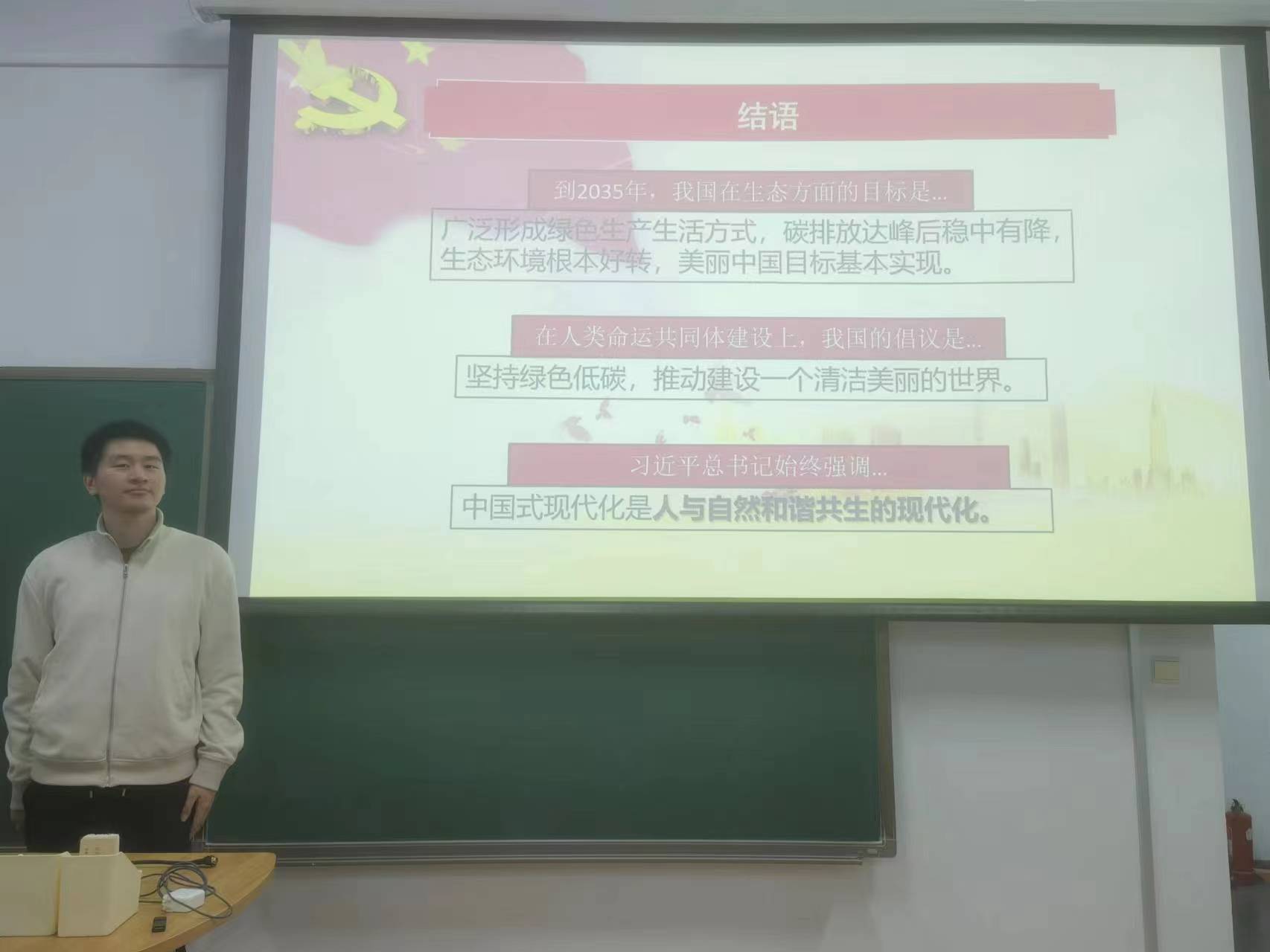 最后,张骁扬同学总结了十年来我国在生态保护、绿色发展方面取得的成就。最后,他做出呼吁,作为先锋模范,我们学生党员与积极分子应当做出表率,牢记绿色观念。人不负青山,青山定不负人。新时代新征程上,人人都行动起来,像保护眼睛一样保护自然和生态环境,坚定不移走生产发展、生活富裕、生态良好的文明发展道路,我们就能不断开创生态文明建设新局面,建设人与自然和谐共生的现代化,为实现中华民族永续发展注入源源不竭的动力。为绿色、循环、低碳发展迈出坚实步伐。