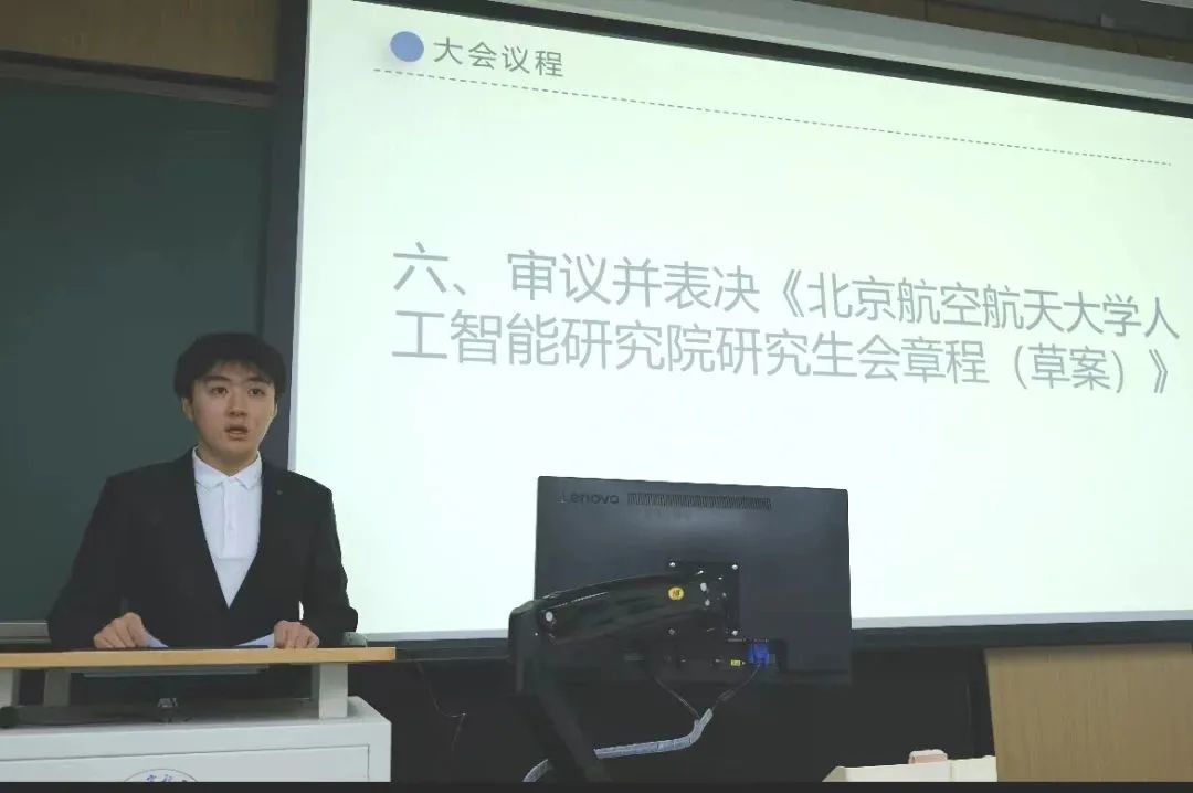筹备委员会成员王新元、康彩新分别宣读《北京伊人99人工智能研究院研究生会章程(草案)》、《人工智能研究院第一次研究生代表大会选举办法》,并交由大会审议通过。