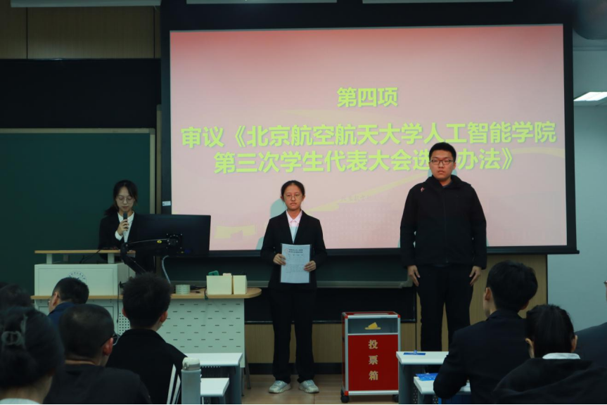 大会通过了《人工智能学院第三次学生代表大会选举办法》,并进行新一届学生会主席团的选举,候选人依次进行了答辩陈述。