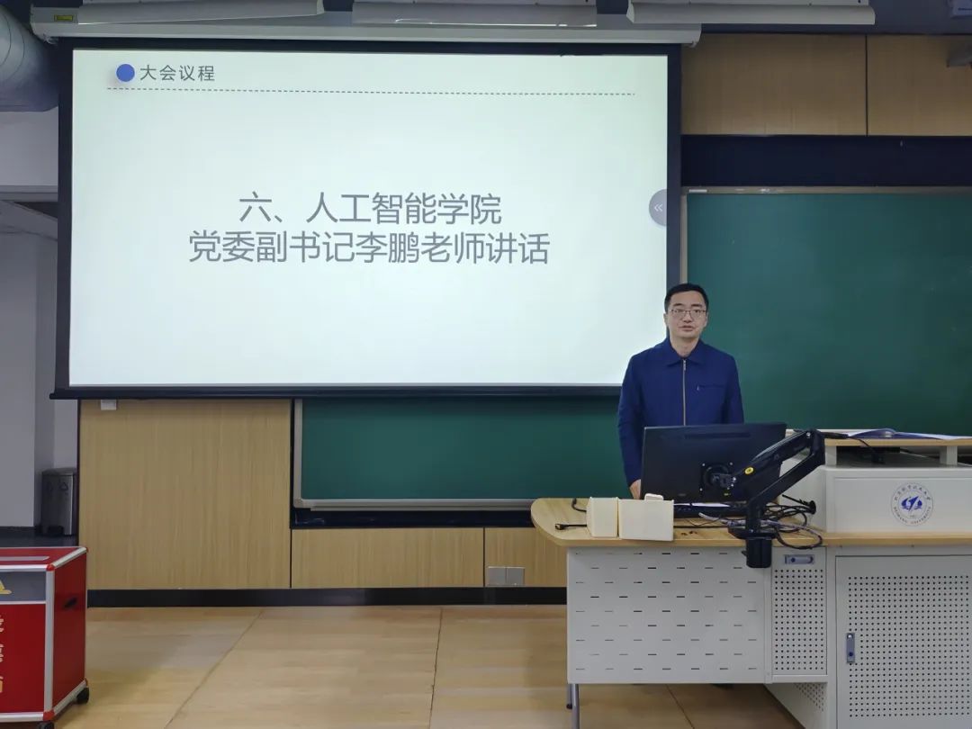 随后,学院党委副书记李鹏老师发表讲话,他代表学院党委对大会召开表示祝贺,对研会成立以来的各项工作表示肯定,并对未来进一步发展寄予厚望。李鹏老师强调,智能时代,人工智能学子要挺膺担当,他带领大家学习了党的二十届三中全会精神和习近平总书记给中国国际大学生创新大赛参赛学生代表回信,鼓励人工智能学子要进一步投身科技创新、促进中外科技交流、推动科技进步;他强调研究生会和学生代表要以学生为中心,发挥“三自教育”功能,坚持思想引领,强化协同联动;最后,他分享了学生工作心得,勉励新一届研究生会要不断提升履职尽责能力,抓好基础,打造品牌,以实际行动切实服务同学成长成才,为学院发展做出更大贡献。